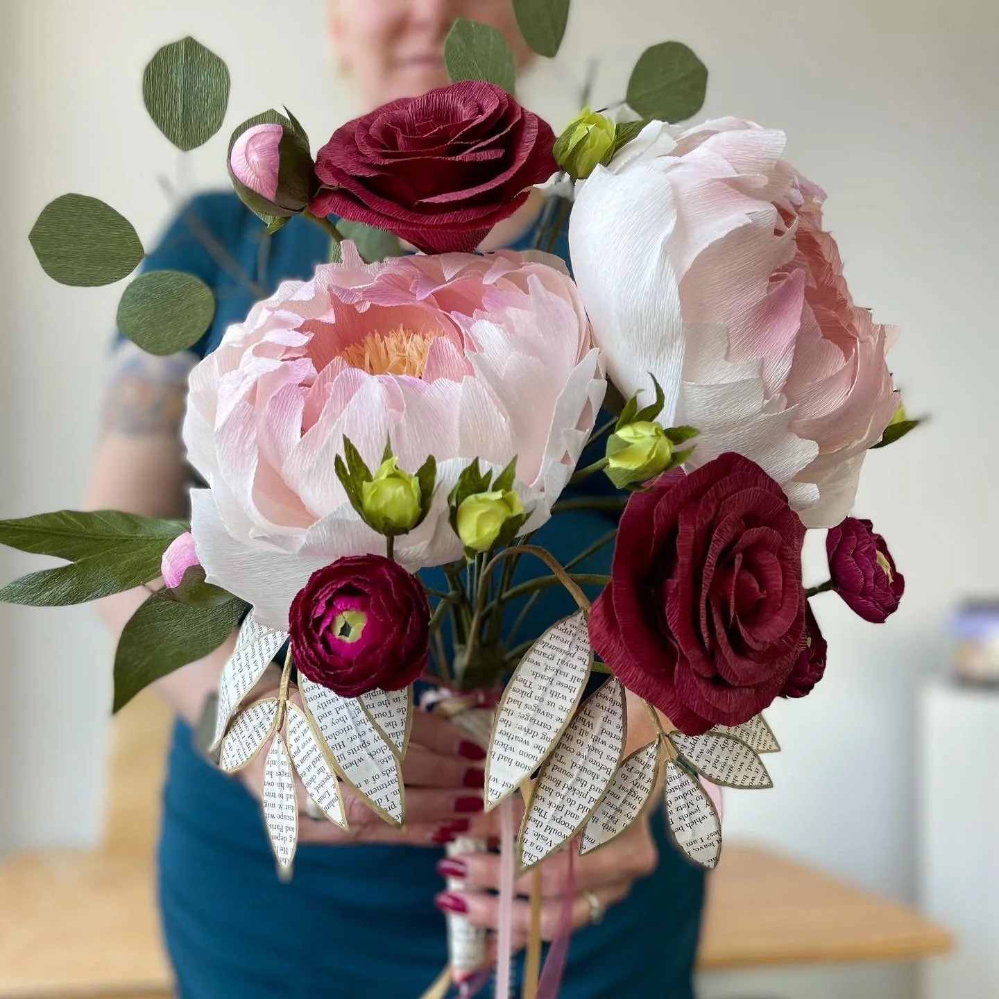 Handmade paper flower bouquet featuring jumbo pink peonies, burgundy roses, magenta ranunculus, silver dollar eucalyptus and customized gilded leaves made from book pages. Bouquet handle also wrapped with book pages and cascading ribbons.