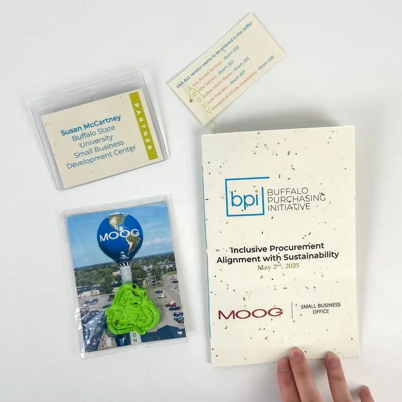 Sustainable and functional. Get seed paper name tags your guests can plant and pair them with compostable badge holders.