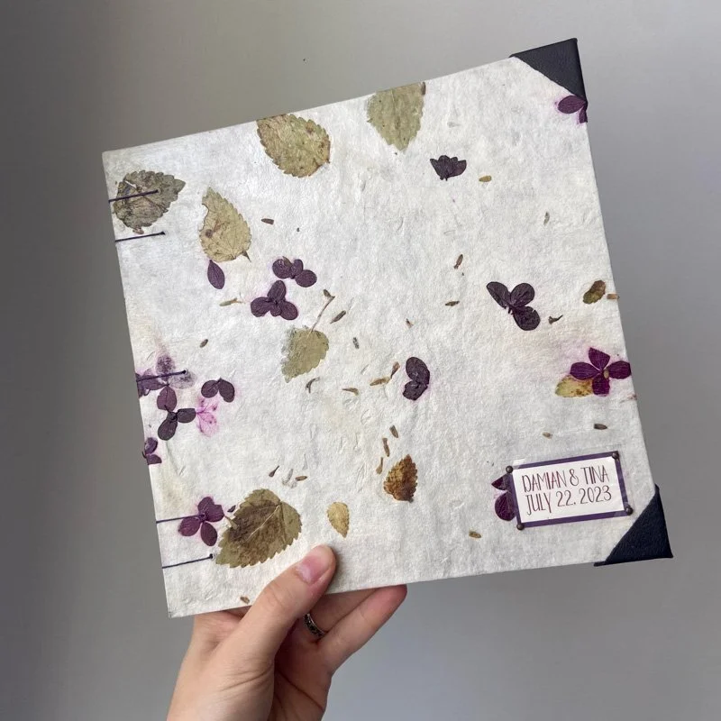 We offer a variety of beautiful artisan papers, leathers and bookcloths. In addition, we offer the option to create custom handmade paper to coordinate your invitations and guestbook together. You can also have us print custom paper using your handmade papers as the background.
